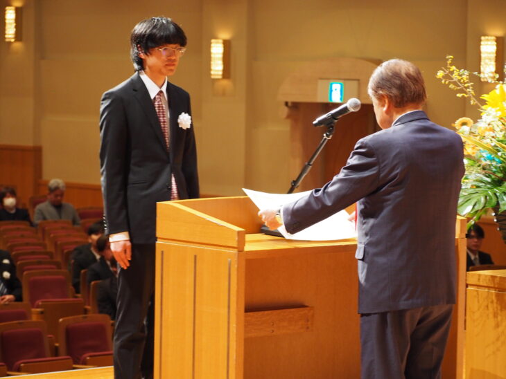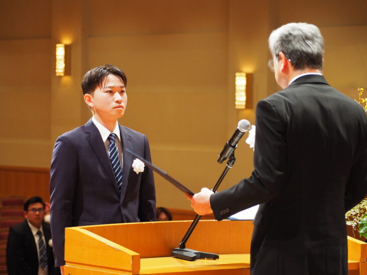 令和7年度は自動車整備科第2期生14名、国際オートメカニック科第1期生15名、合計29名が卒業されました。卒業生を代表し、自動車整備科の富山巧大(とみやまこうだい)さんが卒業証書を授与されました。
