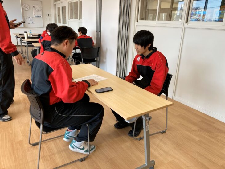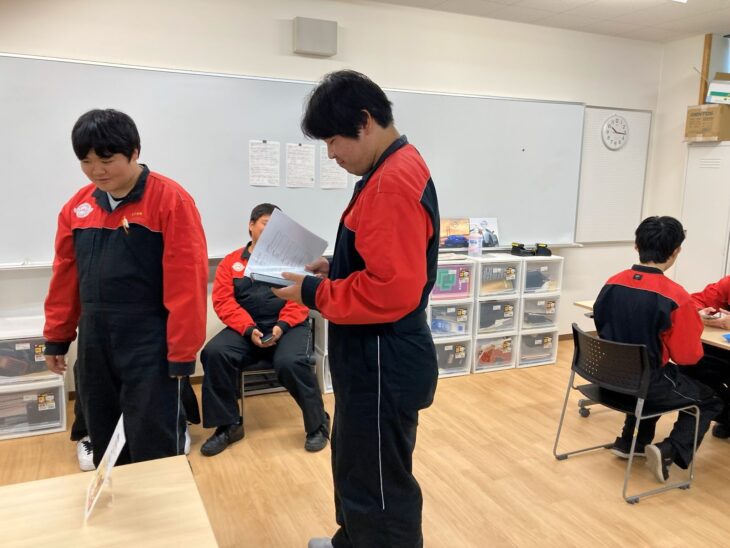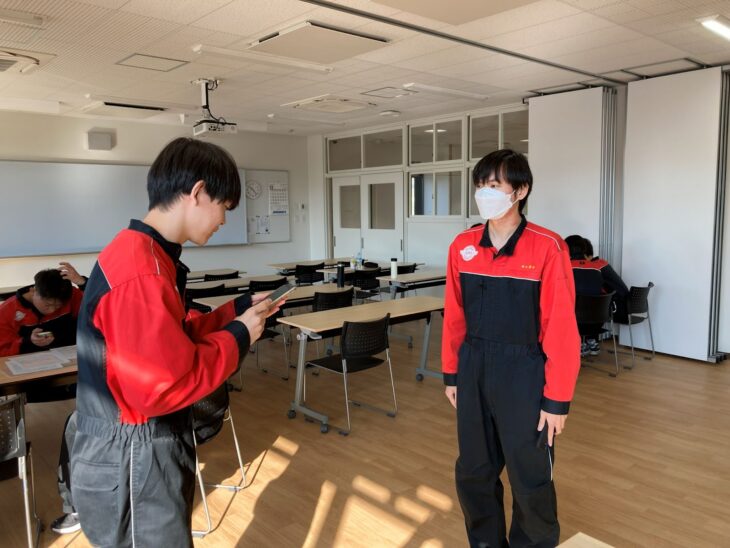 毎年、冬の寒さが身に染みる頃、2年生を対象にした接客対応の実習を行っています。今回はその実習風景をお見せします。右側の学生がお客様役、左側の学生がお店側の役を演じています。