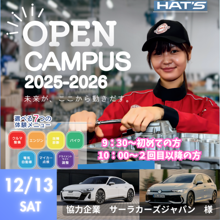 体験実習は「クルマの整備」、「エンジンを触ろう」、「故障診断にチャレンジ」、「バイクの整備」、「電気自動車の構造」、「マイカー点検」、「アライメント・ライト調整」など7つの体験メニューから選べますので、何回参加しても楽しめる内容です。