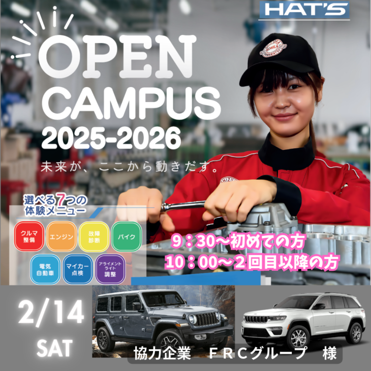 体験実習は「クルマの整備」、「エンジンを触ろう」、「故障診断にチャレンジ」、「バイクの整備」、「電気自動車の構造」、「マイカー点検」、「アライメント・ライト調整」など7つの体験メニューから選べますので、何回参加しても楽しめる内容です。