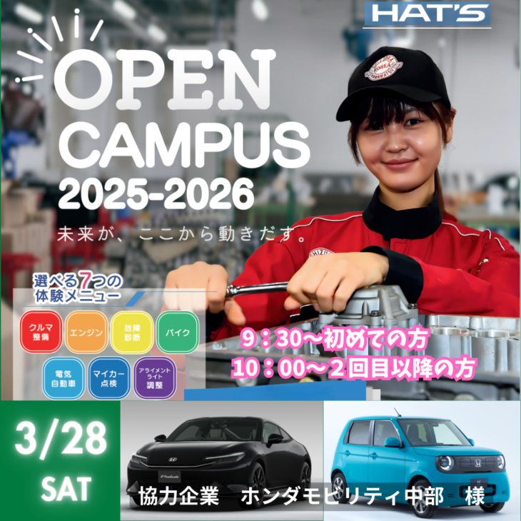 体験実習は「クルマの整備」、「エンジンを触ろう」、「故障診断にチャレンジ」、「バイクの整備」、「電気自動車の構造」、「マイカー点検」、「アライメント・ライト調整」など7つの体験メニューから選べますので、何回参加しても楽しめる内容です。